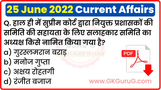 मैं उम्मीद करता हूँ कि आज 25 June 2022 Current Affairs In Hindi का Post आपको अच्छा लगा होगा। ऐसे ही Daily Current Affairs Quiz पढने के लिए GKGuruG.Com पर विजिट करें। धन्यवाद.....