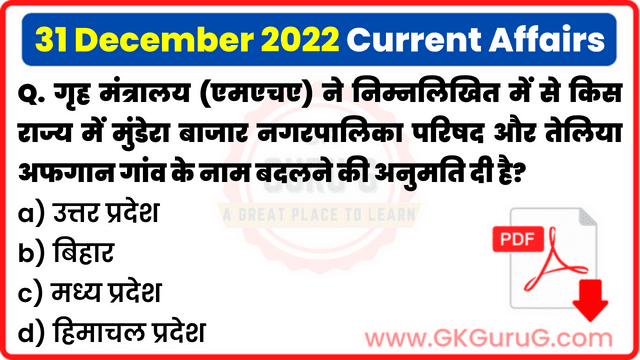 मैं उम्मीद करता हूँ कि आज 31 December 2022 Current Affairs In Hindi का Post आपको अच्छा लगा होगा। ऐसे ही Daily Current Affairs Quiz पढने के लिए GKGuruG.Com पर विजिट करें। धन्यवाद.....